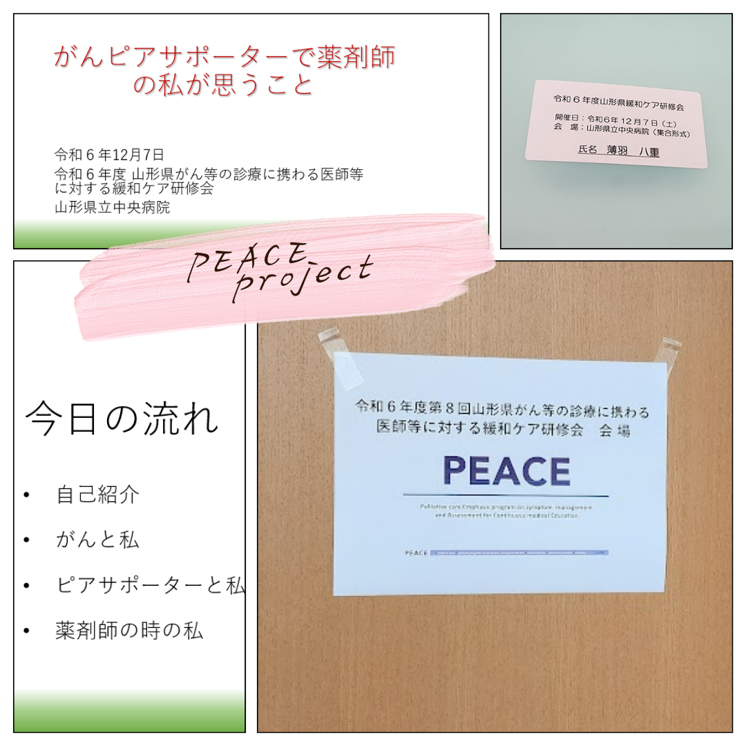 令和6年度山形県がん等の診療に携わる医師等に対する緩和ケア研修会 12月7日 今年度も、山形県がん等の診療に携わる医師等に対する緩和ケア研修会で、「がん体験者やケア提供者からの講演」のセッションで、ピアサポートについてのお話をさせて頂きました。 がん経験者ピアサポーターとしてのお話と、がん患者さんの不安や戸惑いを想像して薬剤師としてどのように対応しているか、というお話をしました。 がん患者さんの気持ちに寄り添ったよりよい診療に繋がるお手伝いができたらいいな、と思ってます。 この研修会、医師限定ではないので、私も受けてみたいとe-learningを完了させたところです。 来年は、別の病院の研修会に申し込んでみようと思ってます。
