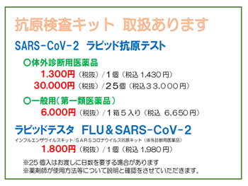 抗原検査キットの販売を行っております。 入荷の状況によっては、販売をお休みしている場合がございますので、予めお電話にてご確認頂くことをお勧めしております。 開局時間外(夜間、休日、早朝など)の販売対応については、お電話にてお問合せ下さい。 問い合わせ先:源泉堂薬局 023-642-2055